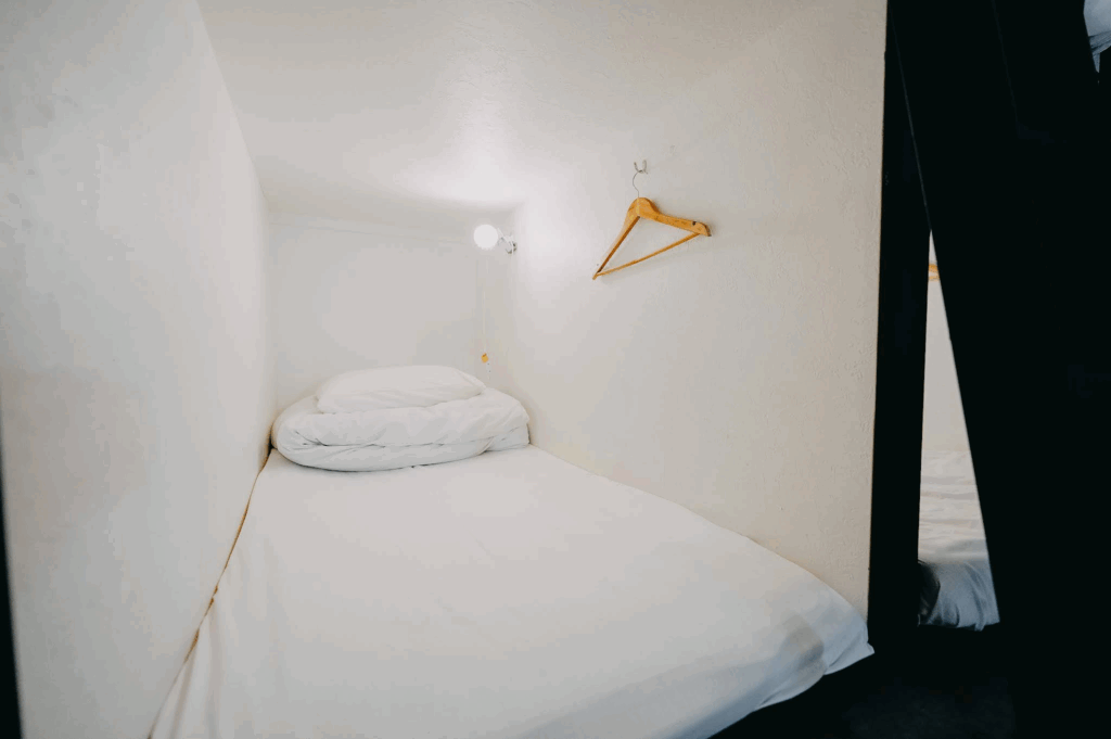 En effet, le personnel est très peu présent, l’enregistrement se fait en ligne et les volumes sont assez limité. L’établissement doit faire au maximum 80mètres carré. Directement après l’accueil, on trouve une dizaine de capsule dans une allée à droite, et dans la direction opposé, des casiers dans le couloir, l’accès à l’ensemble douche – WC – machine à laver, un petit espace pour manger avec vu sur la rue et au fond un petit coin avec 6 à 8 capsules.